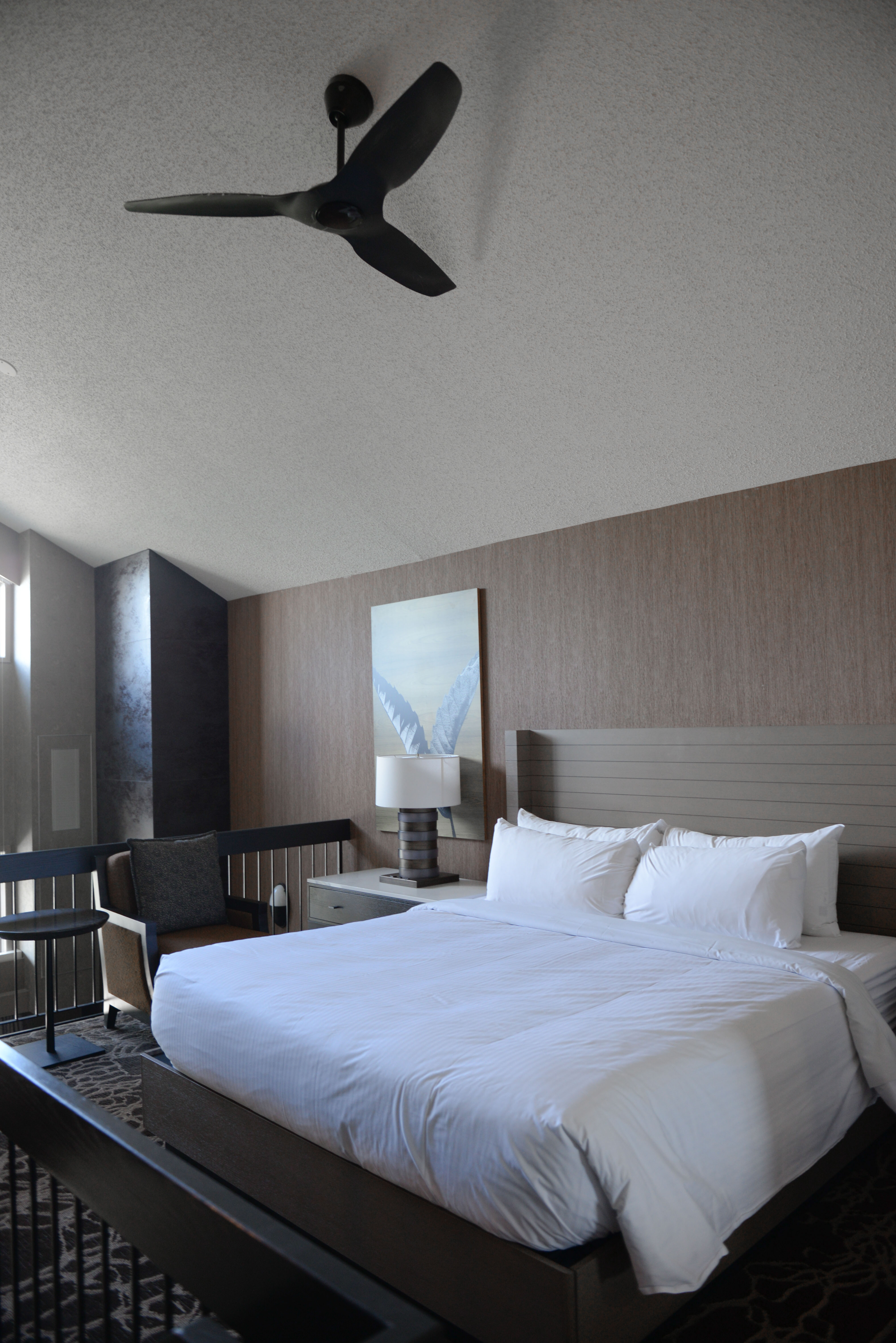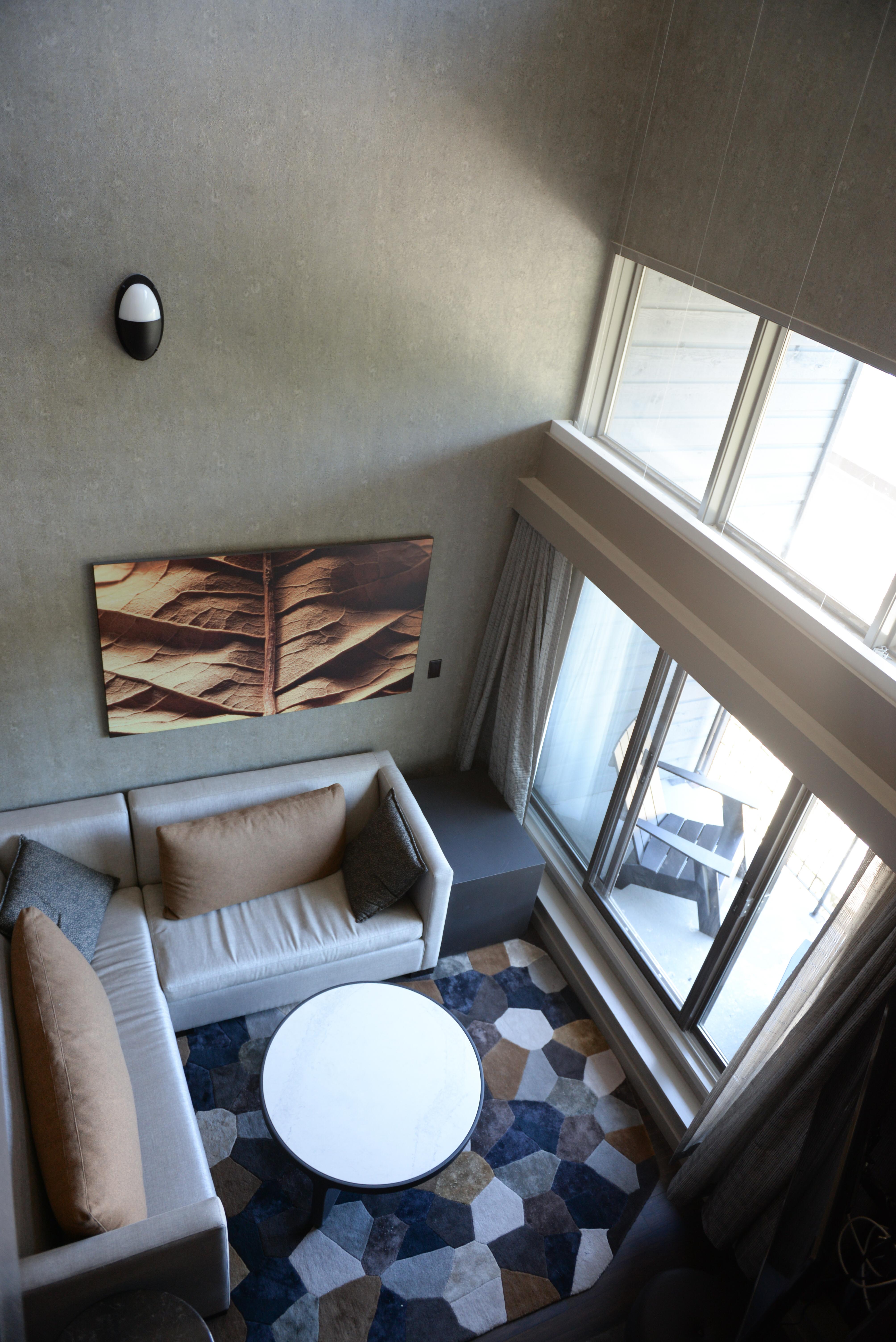 What surprised us about the hotel was the way that two opposing aesthetics created a theme that was so unique and refreshing. The newly renovated hotel presented a clean, bright, and inviting entrance. Arriving in our room, the dark wood, rich colors, and luxurious surroundings created a coziness that welcomed us into the lovely retreat. We had the pleasure of staying in the bi-level loft, which comes equipped with everything you’ll need to hunker down for the weekend. The main floor’s dining area flows into the living room where we sprawled and relaxed for the night. Our favorite feature could be felt as our gaze lifted upward – two story floor-to-ceiling windows. They let in lots of light with views of forests and peaks from indoors or from the personal balcony. Although the summer warmth was great for our stay, we’re sure the fireplace would be a calming way to end the night before heading upstairs to crawl into the spacious king bed.